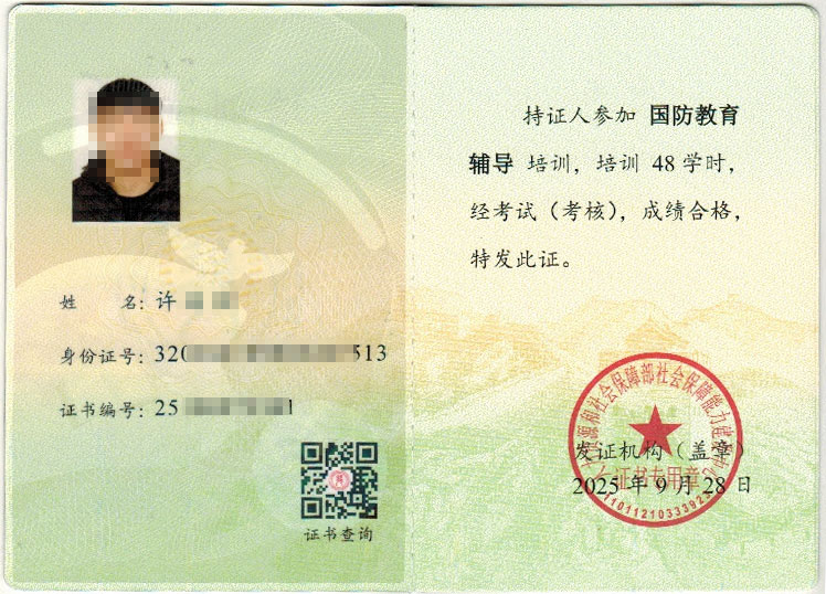 参加2025年10月31号考试批的国防教育辅导项目培训人员和部分补考通过人员,培训考试合格者,经人社部能建中心核准,《国防教育辅导》培训证书已于近日颁发,请各单位注意查收!